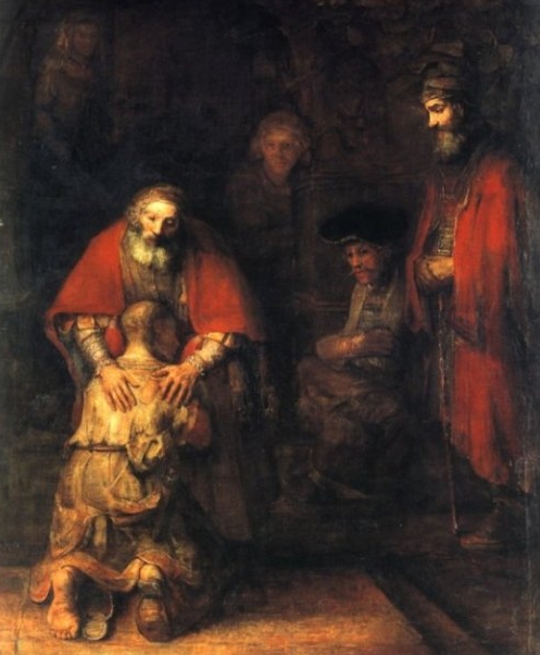 그림에는 여섯 사람이 보인다. 붉은 망토를 걸친 자애로운 표정의 노인은 아버지이고 남루한 차림의 뒷모습은 작은아들이다. 아버지 옆에 붉은 망토를 입고 차가운 표정으로 서 있는 남자는 큰아들이다. 그 옆에 앉은 사람과 그림 중앙 조금 뒤편에 윤곽조차 희미한 남자는 시종, 왼쪽 위 어둠 속에 그림자처럼 희미한 여자는 시종이거나 친척일 것이다. 빛의 화가라는 별호가 부끄럽지 않게 램브란트는 각 인물의 얼굴에 빛의 강도를 다르게 표현했다. 등장인물 중에서 아버지의 얼굴이 가장 환하고 해같이 빛난다.