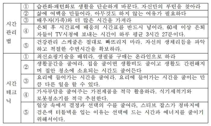 은퇴 후 주어지는 많은 시간을 어떻게 관리하는 것이 좋을까? 월간 잡지‘전성기(www.junsungki.com)’에는 은퇴 후 시간 관리법 5가지와 은퇴 후 모자라는 시간을 효율적으로 활용할 수 있는 시간 테크닉 5가지를 다음과 같이 제시하고 있다.
