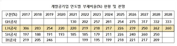 개발공기업의 부채비율이 상대적으로 높을 수 밖에 없는 것은 숙명이다. 그나마 LH공사는 부채비율을 500%까지 유지할 수 있지만, 동일한 개발업무를 하는 광역지자체 투자 지방공기업은 400%까지인데 그나마 행안부에 의해 대부분 300%이하로 규제를 받고 있고, 3기 신도시에 한해서는 350%까지 공사채를 발행할 수 있도록 되어 있다. 따라서 LH공사는 아직도 투자여력이 충분하지만 GH공사 같은 지방공기업은 더 일을 하고 싶어도 할 수 없게 된다.